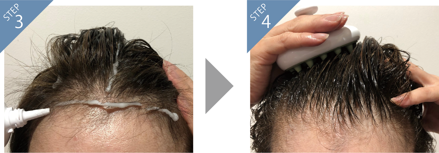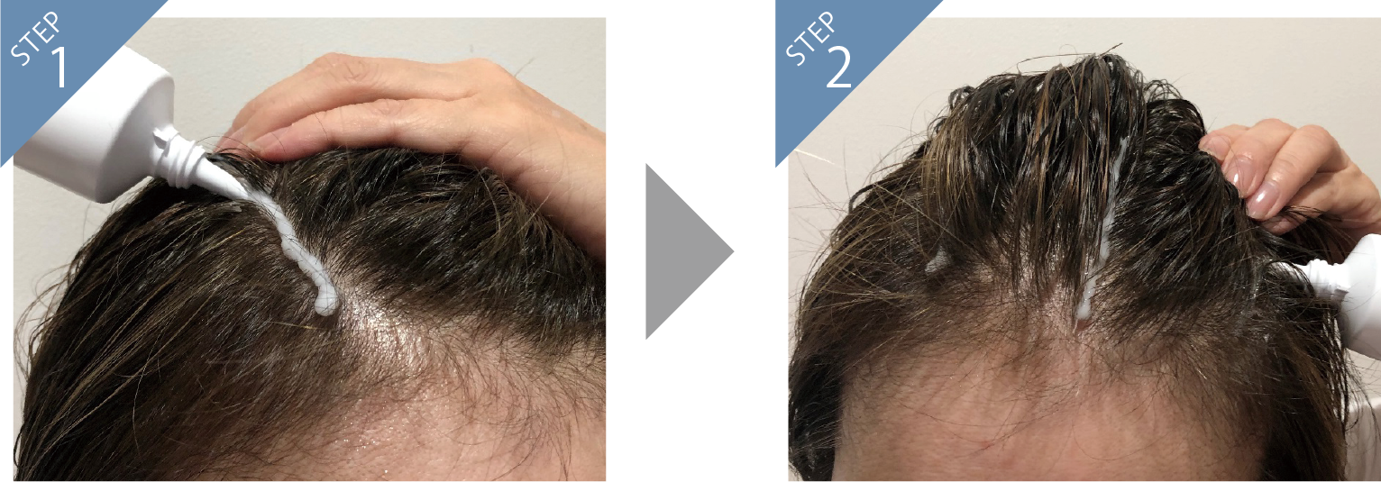 ノズルを直接頭皮にあて、筋をつけるように塗布して下さい。